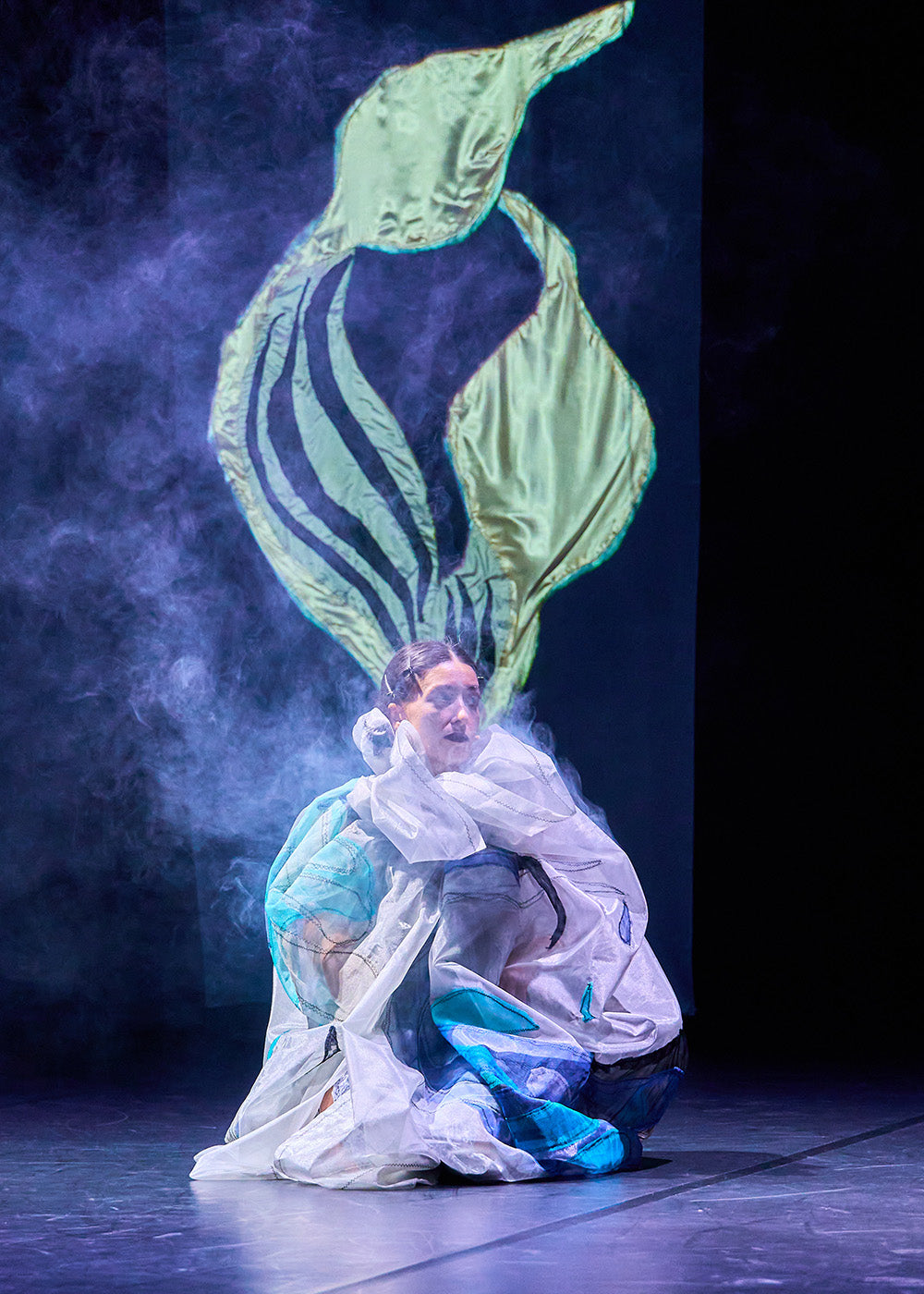 Claire Lefèvre’s “Loie” rekindles Fuller’s legacy through queer intersectional lenses, treating history less as a monument, and more like a material to be bent, teased, and re‑lit. Moving between queer love letters and discoveries of the darker aspects of a personal dance icon, she lets camp, softness and comedic shimmer coexist without apologies. Supported by the light and layered artworks by textile artist Sophie Utikal, and by projections by video artist Maanila Santos De Moraes, the text and movement materials open space for a gently rebellious reimagining of dance heritage, through another version of a lecture performance that activates the empathy of the audience through its mix of personal and collective (her)story.
