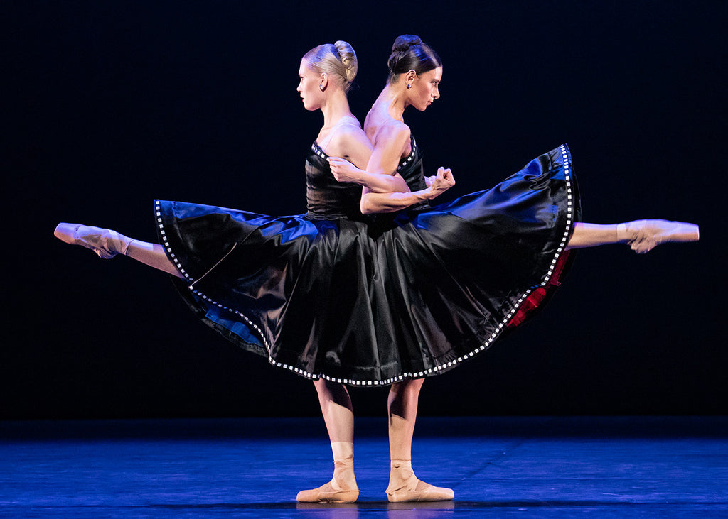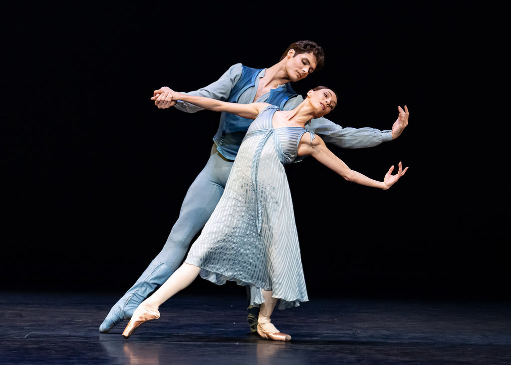 The closing dance on the program, the NY premiere of Hans Van Manen’s “Frank Bridge Variations,” also had a mismatch between the music, the costumes, and the steps. Set to Benjamin Britten’s compositions, a small cast took on the score’s big emotions wearing simple unitards (by Keso Dekker) and flat shoes. The dark outfits and lighting, by Bert Dalhuysen, made the dancing feel a bit sleepy. Slow pedestrian walking in group patterns featured the hands-on-thighs motif, as if the dancers were roaming dark alleys with their hands in jean pockets. That they were in matching unitards made it peculiar, however. The pacing was somehow ponderous even when the excellent leads were doing flashy solos. Qian Liu and Young Gyu Choi were a taffy-like pair, and Constantine Allen was terrific in a speedy emboîté variation.