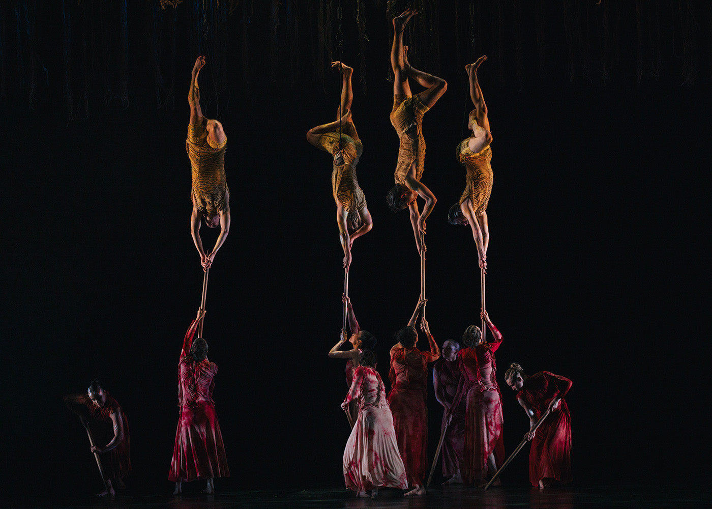 In the first full-length collaboration, commissioned by the Australian Ballet, everything flows in a custodianship about renewal and balance.[5] In an ecological timeline bigger than you or me, beneath the cracked clay in “Sleeping Yams,” perspective is also altered. The stage reveals itself to be a cross-section of a subterranean world of interconnected roots and ancestral songlines. Overhead, five sleeping yams, Tamara Bouman, Brett Chynoweth, Adam Elmes, Trevitt, and Callum Linnane, awaken. One by one, they extend an arm, rotate their head, and huddle. Suspended by cables, they gently unfurl, and it is magical to behold that which is typically hidden from my view. Whether in ribbon-like extension or folded like a teardrop with legs raised overhead, tucked in the warmth of the earth, both songlines and plant matter. “Plants are Country through songlines and story, carrying knowledge about how to keep our lands and seas healthy.”[6] And like all good collaborations, where one company ends, and the other begins, is impossible to say, such is the successful entanglement.
