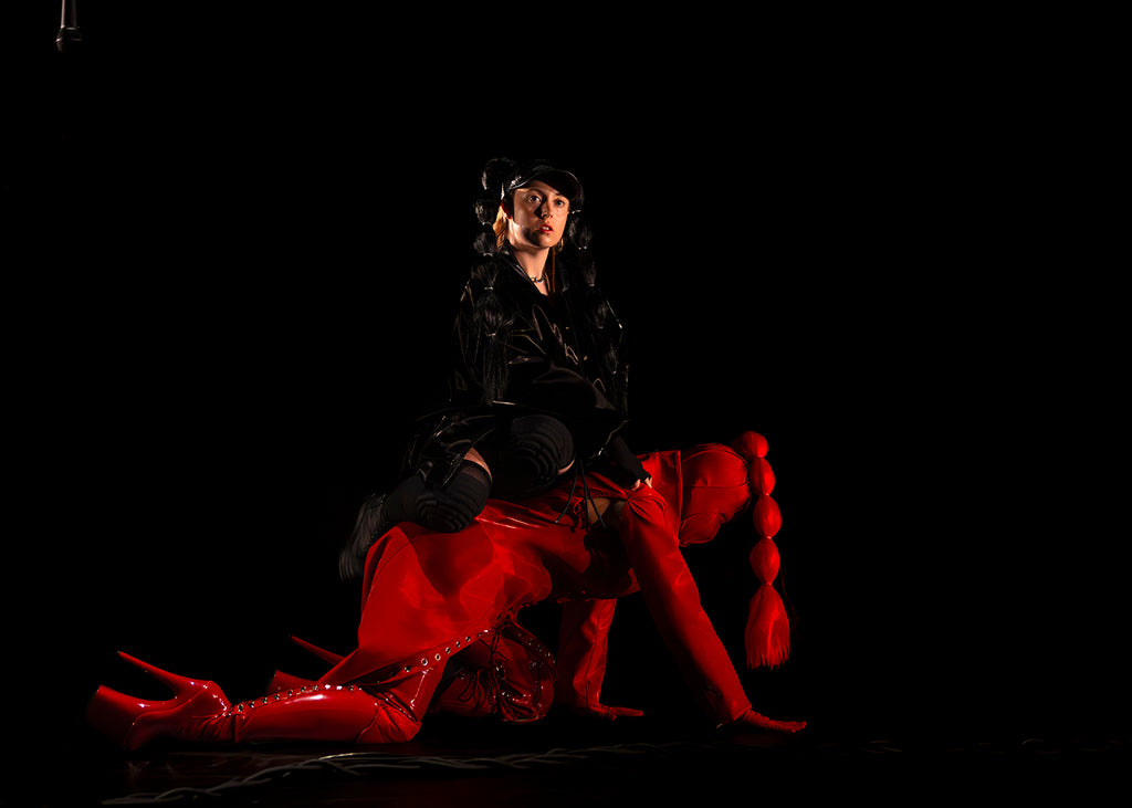 Energy for which we do not have the words is echoed in Jenni Large’s whip-cracking, latex-encased work, “Lip,” performed by Large and composer Anna Whitaker. Only this time the energy investigated is that of “female eroticism [as] a tangible power worth harnessing.”[5] From Large’s entry on the stage, thrashing like a rolling hexagon, dressed head to toe in red, replete with a long whip of hair lashing from a knotted, high ponytail, she is self-reliant, and refuses to be harnessed by others. Equally, when she removes almost all of her costume, head covering included, she remains self-reliant and in complete control. Standing at the foot of the stage, overhead she holds a sound device which omits a series of incessant, loud thwacks upon her application of pressure. Shifting the viewpoint of cinematic portrayals of femme fatales such as Glenn Close in the film Fatal Attraction, this rewriting of the script is perhaps closer to the original (test audiences requested Close’s character Alex’s punishment be greater than originally intended.[6]) A message driven home with lighting design by Rachel Lee which holds Large and Whitaker in diagonal shafts of light.