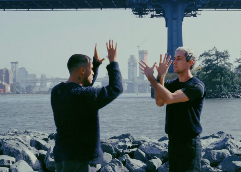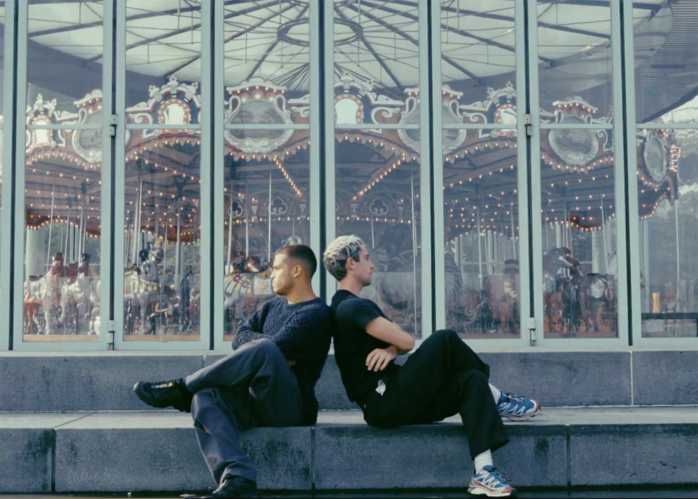 The dance begins gently with men seated next to each other in front of a window looking onto a carousel, with the raising other of a foot, partially an invitation into playfulness, part flirtation, all “conversation.” The choreography—although rooted in contemporary dance language—has a healthy mix of B Boy-like moves as well as entangled limbs reminiscent of Rauf Yasit’s Rubberlegz. There is an ample use of gesture and weight-sharing as we follow them along, sometimes one dancer “listening” as the other “speaks.” The camera is always moving, which gives us as viewers a deeper sense of the passage of time and also ups our engagement into the two men and to the story. The locations are beautiful, and the color is lush, further drawing us into the romance of the film. The exchange and connection that emerges between them is delivered entirely through dance—a conversation, an exchange of experiences, and a sharing of who they are as individuals, entirely through movement. The beautiful score is ambient and instrumental—no hard hitting rhythms that the dance rides literally—and like the two dancers the score’s relationship to the choreography is autonomous yet completely sympathetic, and to this viewer, really beautiful.