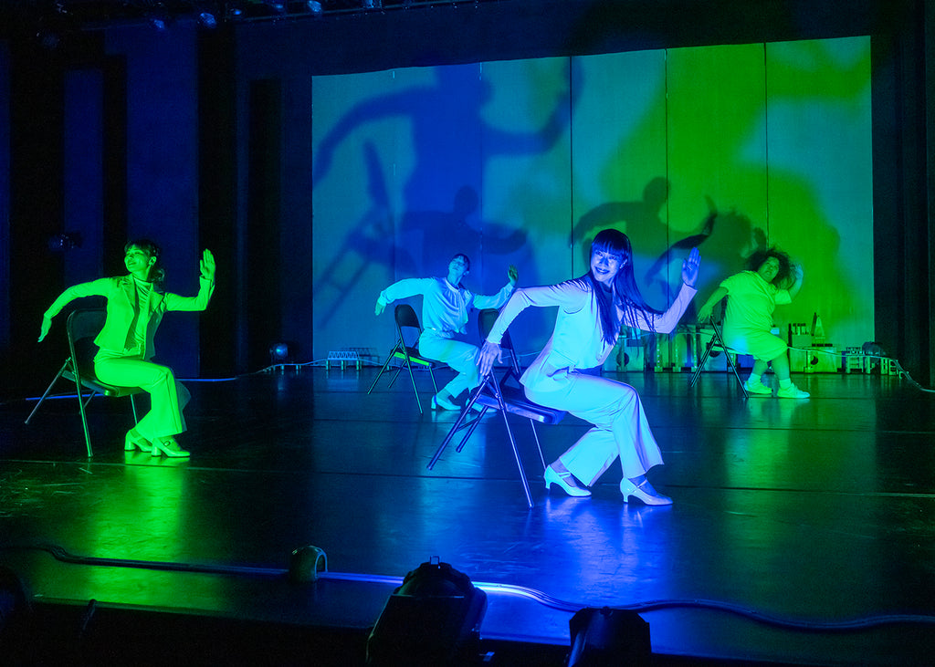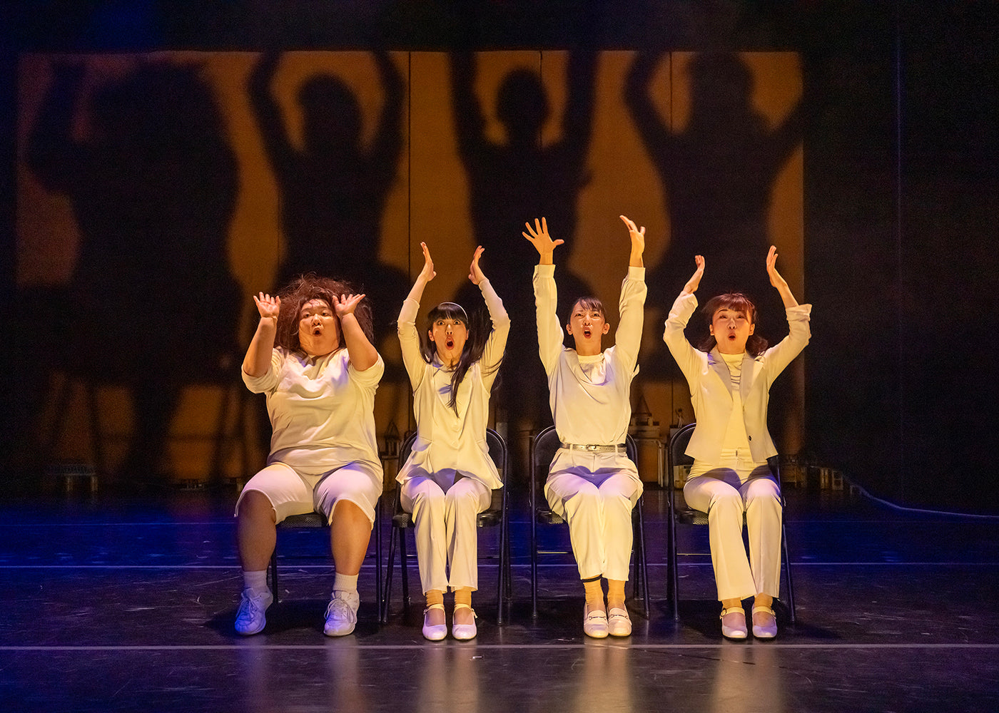 Seven dancers in crisp, white pantsuits entered dancing a kind of drill team routine—but with prayer gestures, bowing, pulsing, and twisting, as they chanted “wish come true.” The group fanned out through the space, with the vocals announcing the hoped for wishes. The moon character circulated in the background providing percussion with a woodblock instrument that made the clopping sound of the geishas’ wooden sandals. Eventually, only four dancers (the geishas) in their white pantsuits remained onstage seated and bouncing on a row of black metal folding chairs as if they were riding the train to the first bridge.