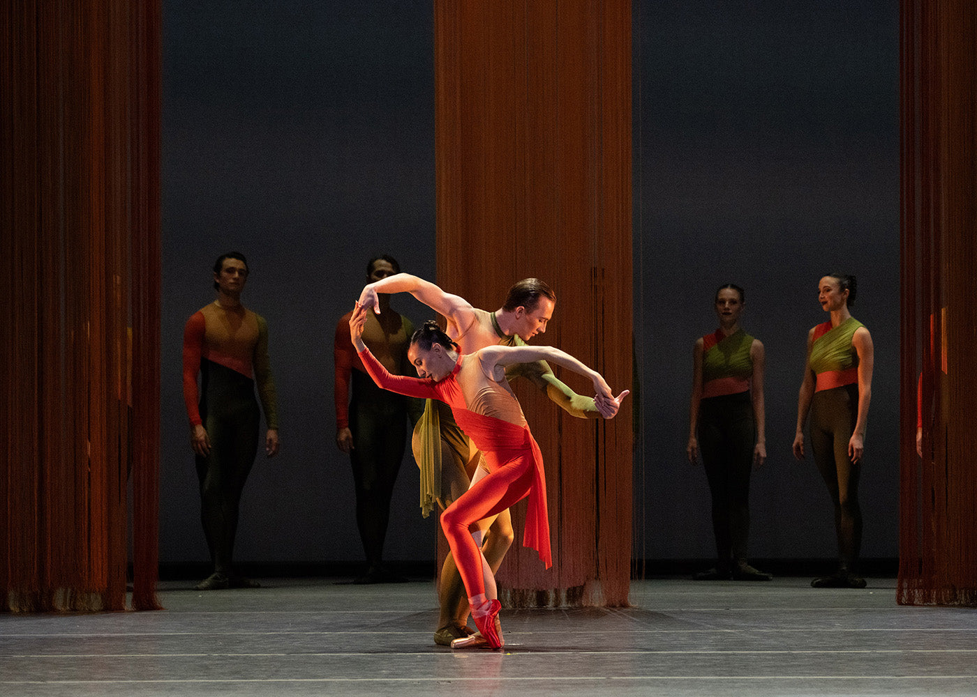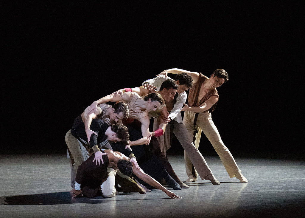 Coincidentally, the second ballet on the program, Ratmansky’s “Serenade after Plato’s Symposium,” also employed color block toga draping (by Jérôme Kaplan). But this time the garb was conceptually fitting. Following the tonal innovations in Leonard Bernstein’s score of the same name, in this dance Ratmansky ingeniously uses ballet vocabulary to approximate Socratic debate. The cast of seven men and one woman (Sunmi Park, beautiful though somewhat superfluous) echo each other’s step motifs with slight alterations in execution and timing. The effect is often like popcorn, with everyone chiming in with their unique interpretation of a passage in a scattershot way. At times, one man tangentially breaks off into a variation on another one’s theme. There is occasional consensus too, brilliantly conveyed through unison and affirmational canon. The choreography gets a little weedy here and there, though that mirrors real argument.