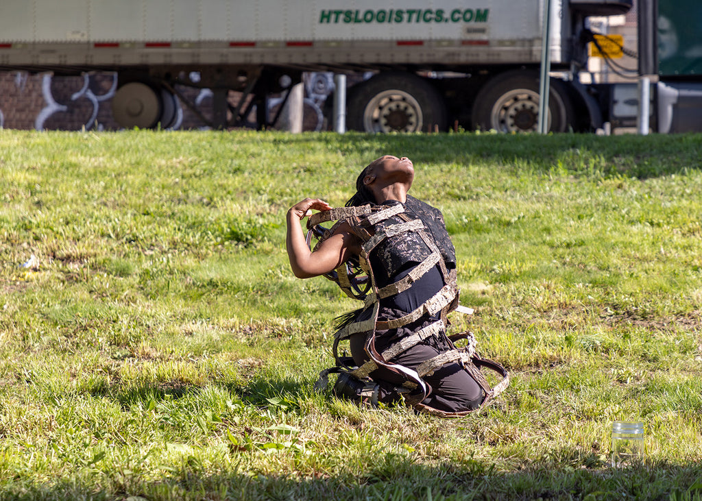 Trickster is on a journey to find the water. We do find it at the second location, Hunts Point Landing, where we encounter more song and dance and storytelling. At that site, we are also able to see Rikers Island as well as Vernon Bain Correctional Center, also known as “The Boat.” Until recently, “The Boat” was operating as a floating jail. A really important aspect of this work is to bridge together these connections between the past and present and to see how the present moment is in conversation with the past. How do we continue to live with “the afterlife of slavery,” as Saidiya Hartman calls it?