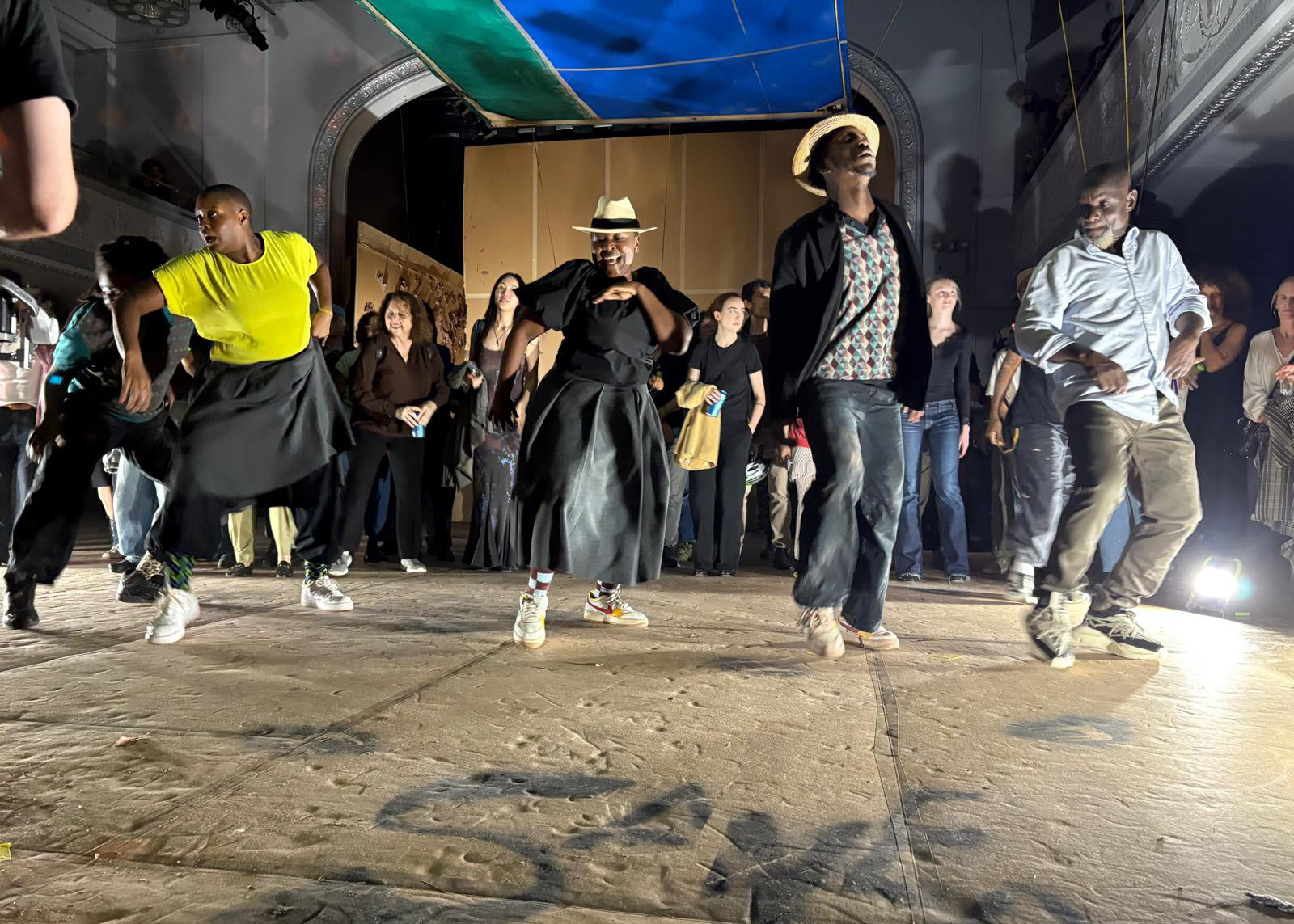 More cast members enter the hall (nine are listed in the program)—men in black t-shirts and black pants, women wearing black skirts. Some sit down on box stools and enjoy a conversation and laughter. Others move through the space with large video cameras or carry placards. By now the sound is at full volume filling the room with the lively jit music of Zimbabwe’s Bhundu Boys, the 1980s band that powered the African resistance movement with its bright and spirited sound. The Zimbabwean dancehall genre lifts spirits and moves bodies with the impulse to dance—its characteristic guitar spinning out buoyant melodies undergirded by drums pulsating their earthy rhythms. It certainly jolts the cast members onto their feet with sudden energy launching them into steppy footwork that would put the Irish to shame. Their dancing morphs into hip isolations that speed up into rapid vibrations that then alternate with repeated large arm movements. People circulate with their drinks and smartphones. It feels like a party.