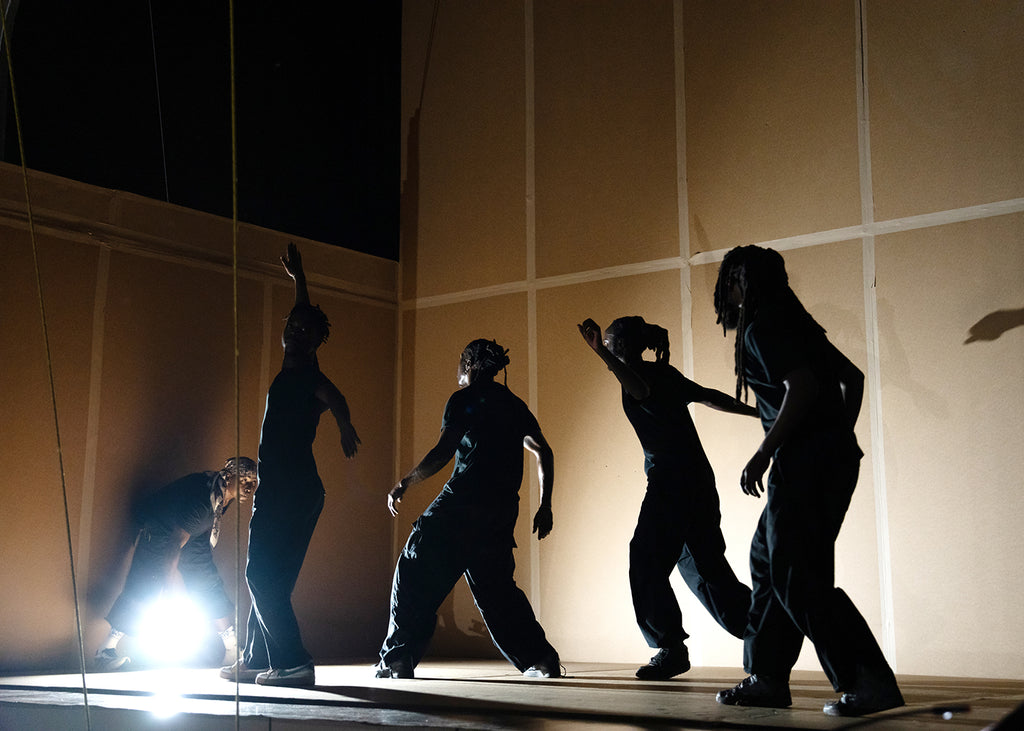 The movements become more space-consuming as cast members travel back and forth through the room—skipping, running, step-kicking, and side-stepping. The melodious strains blur into a murky cacophony as someone grabs a spotlight from the floor and moves it, redirecting our gaze. A cast member introduces a soccer ball, and more people get in on the action—chasing and kicking the ball. The room and the game keep changing; now the ball is flying overhead.