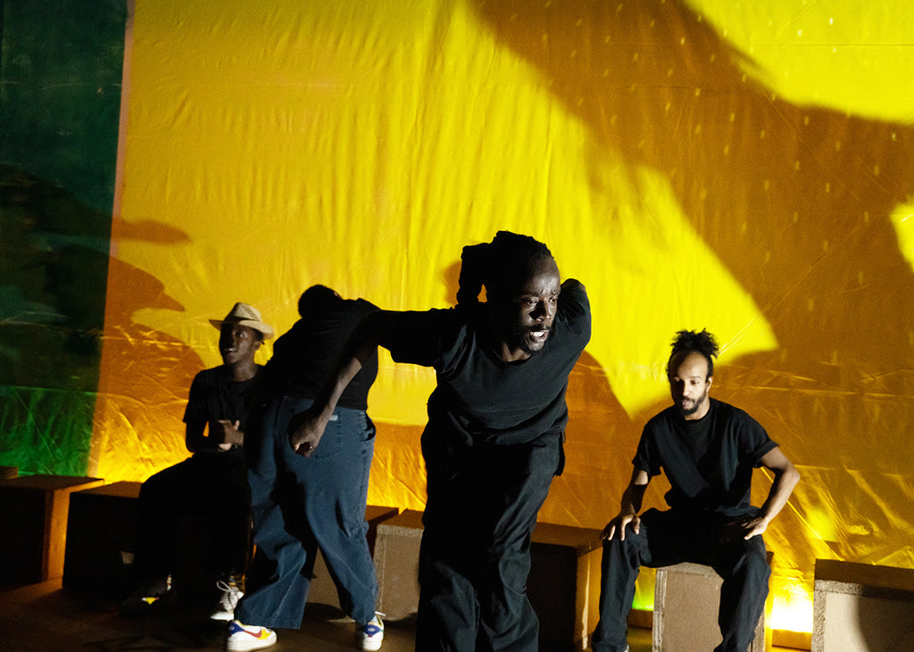 Two of the overhead tarps, stretched on large wooden frames, are now lowered to form side panels reconfiguring the public space. The energy changes; and what was a party now descends into violence. A victim is thrown against a stage wall caked with mud. His sweat-covered skin is now mud-smeared as he falls to the floor, the others kicking him. The muddied victim walks amongst the audience members extemporizing on a saxophone as the Afro-pop soundtrack joins in to rouse everyone to dance again—albeit with a more sober quality. The cast members lie down on the floor and rest for a spell while the audience members continue the dancing.
