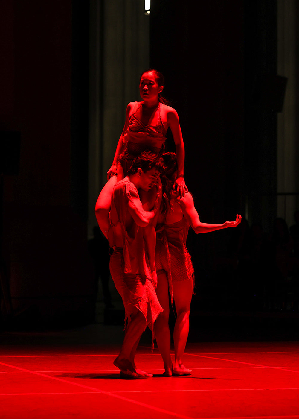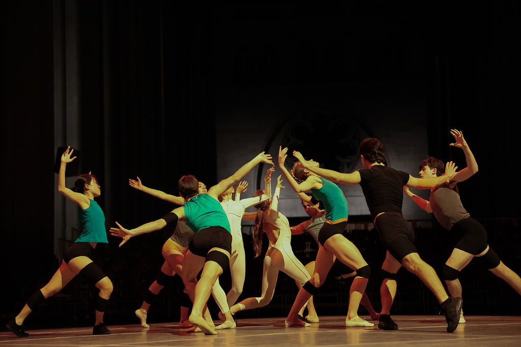 Miriam Miller steps into the center and raises her arm with deliberation, pressing her palm upward to the vaulted Gothic ceiling of the cathedral. In a moment, she’s swept off her feet, lifted while a troupe of dancers dressed in blue-grey—a contrast to her taupe leotard—circle around her. The strings begin thrumming.