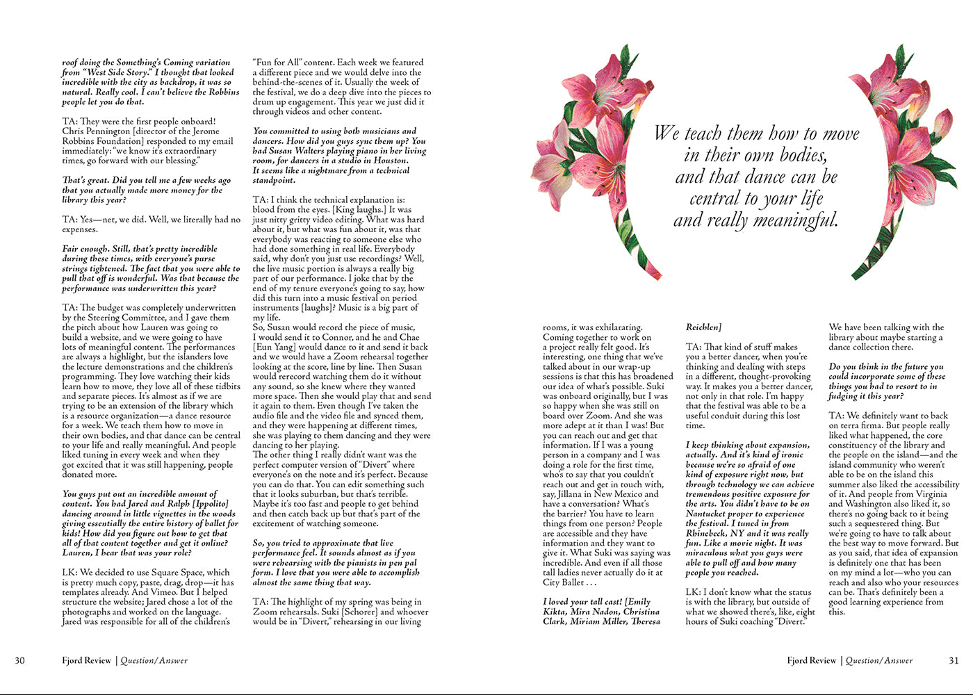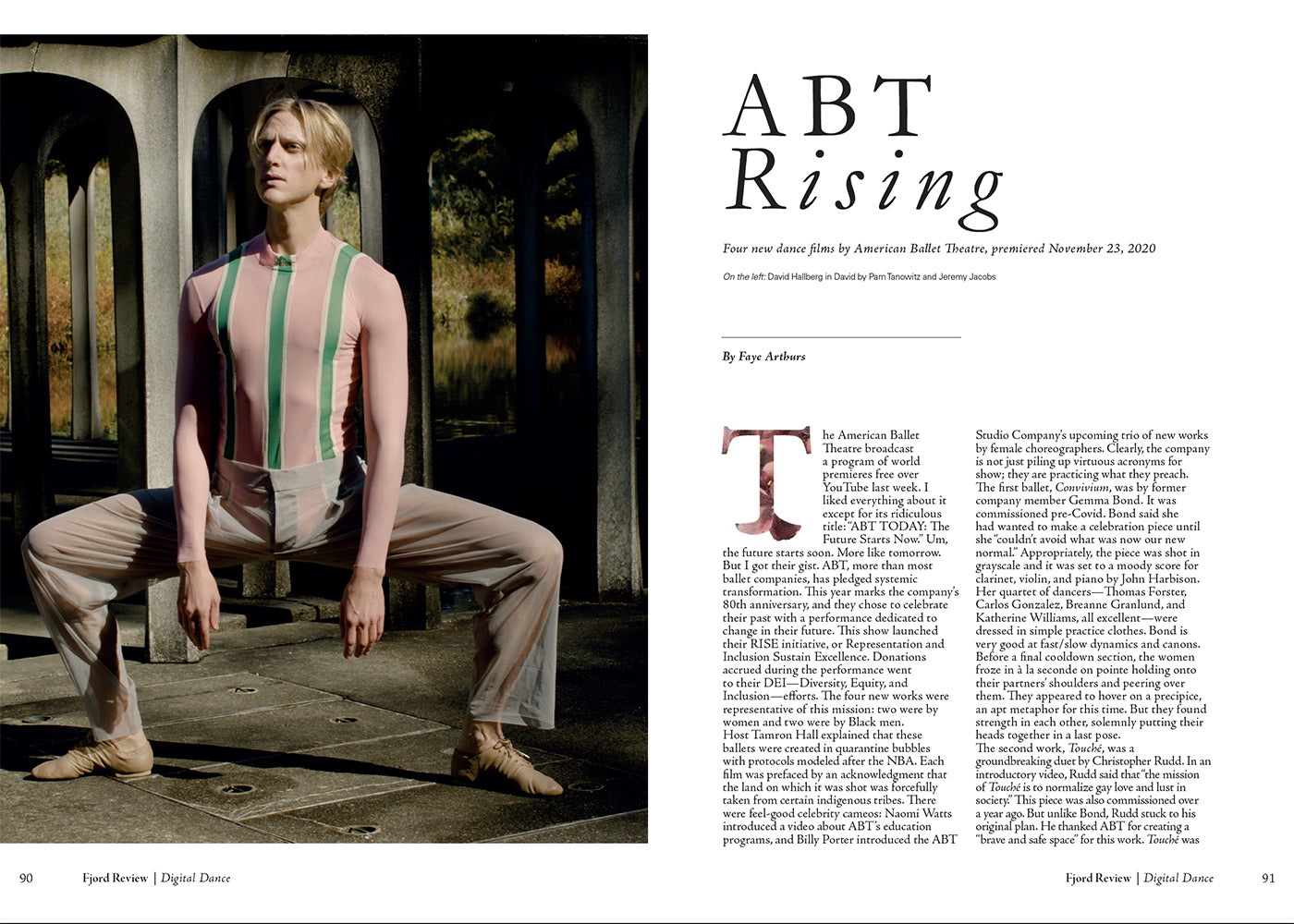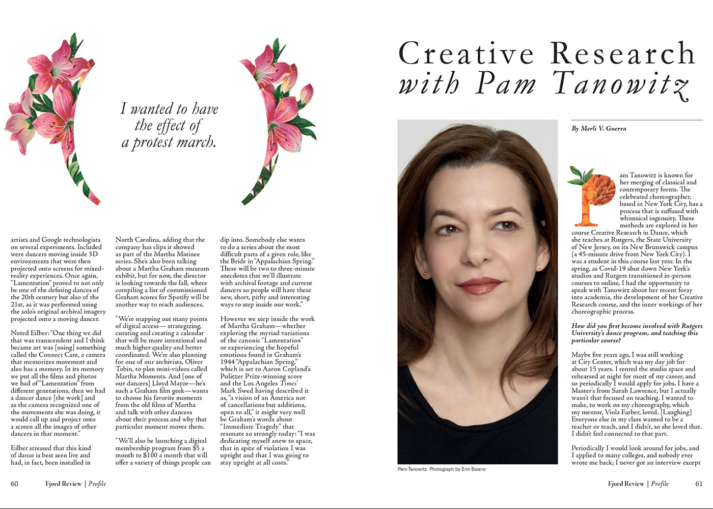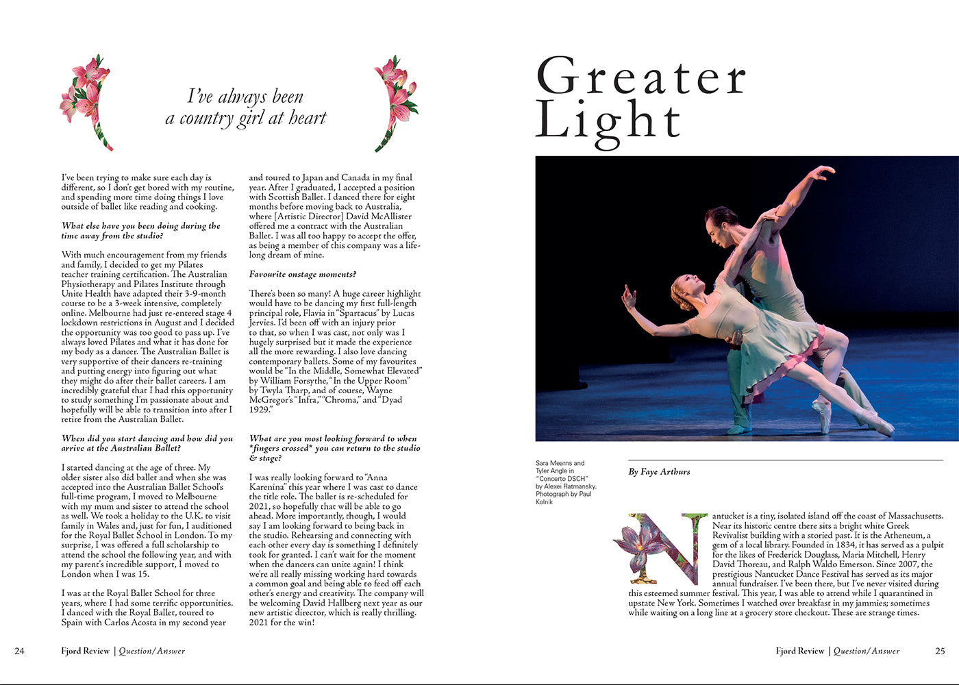 What's inside: Exclusive interviews with Janet Eilber, artistic director of Martha Graham Dance Company, choreographer Pam Tanowitz, historical discoveries of Katherine Mabel Pearse's Modern Dance Camp, reviews of Alessandra Ferri's Italian Gala, summer success at New York's Kaatsbaan, how to mount a digital dance festival with NYCB dancers Tyler Angle and Lauren King, what to read, reviews of dance and dance on screen from around the world.