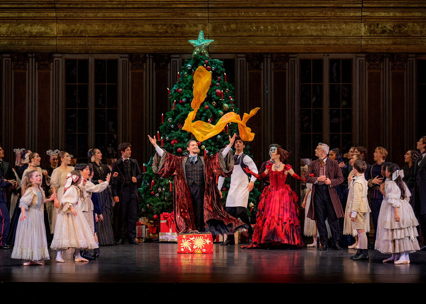 Among the eye-grabbing visuals are a 6-metre candlelit Christmas tree, human-sized baubles that descend from the rafters like hot air balloons, and 200-plus period costumes, each rich in colour and sheen, from the sparkling candy-cane Mirliton tutus to the Rat Army’s oversized heads, attached firmly enough to survive scissor leaps and jujitsu rolls. The projections uplighting the backdrop are a little tired, although they provide a gorgeous reference point during the international dances of Act II, with vibrant clippings that allude to individual regions and apparel. While I could have done without the interpolations of Simon Callow in his recorded voiceover for Drosselmeyer—interjections that explain what’s already quite apparent—the overall staging is darling, with atmospheric touches that keep it full but not too busy.