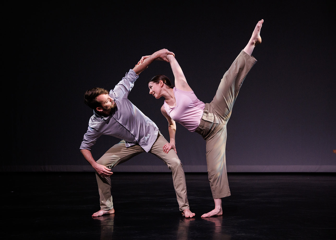 The final work of the evening, “Assuage” (2018), a duet Stathas created for his new company, delivers more of the electrical charge I’ve missed up to this point. Performed by Twomley and Graynor to Arvo Part’s minimalist “Tabula Rasa,” the dancers walk on their knees and form angular shapes. Their partnering has a rough push and pull. He grabs her hand and won’t let go. She yanks his arm while lodging a foot to his thigh for leverage. The force they generate sends them into a spin. They meet in an angry embrace. In the end, she shrugs him off and struts away on her own. I look forward to seeing more of Peter Stathas Dance.