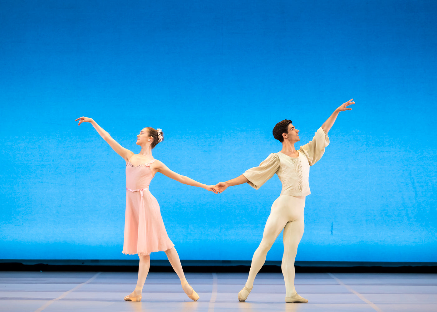 Eve Belguet and Davide Alphandery formed a compelling central partnership. Belguet, who had already distinguished herself in school performances at the Paris Opera Ballet School, confirms a rare combination of softness and radiance, revealing an artist of considerable promise. Her technique is impeccable yet fluidly responsive to the music, and she projects charisma that naturally draws the eye. Together with Alphandery, trained at La Scala, she formed an exceptional pairing, with him proving an attentive and solid partner. The ensemble largely met the demands of the choreography, articulating the rapid footwork, the clarity of the épaulement and the subtle forward and backward displacement of the hips typical of Balanchine’s vocabulary. In the male sections, the jumps occasionally tested the uniformity of coordination, yet the overall energy remained buoyant.