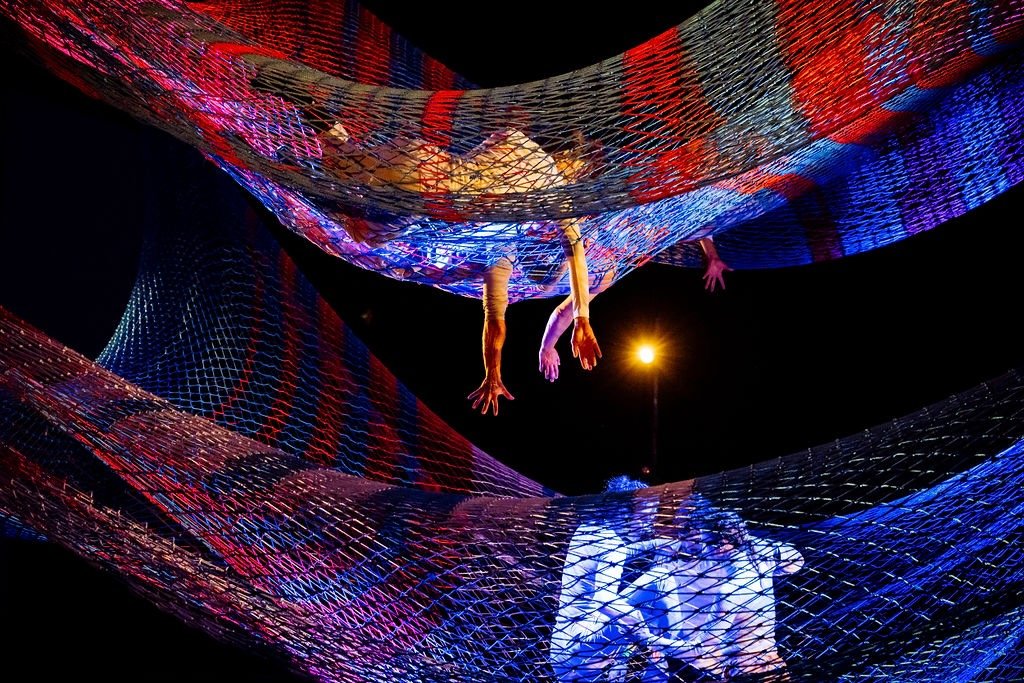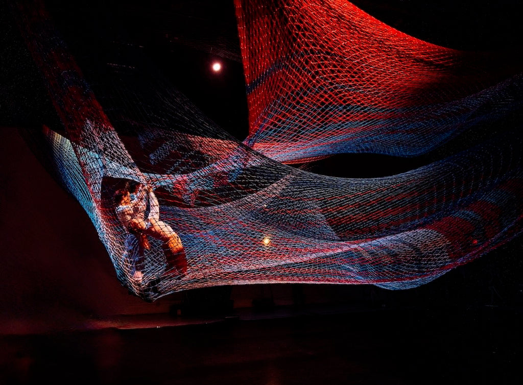 On one of the longest days of sunlight, the innovative, multi-disciplinary performance outpost in New York’s Hudson Valley, PS21, is presenting a “sneak preview” of a work under development in an onsite, four-week residency. The venue, with its 100 acres of unspoiled landscape, is dedicated to hosting residencies for the incubation of adventurous and oftentimes unclassifiable work. Surrounded by green slopes and leaf-laden trees, the open-air Pavilion Theater has been transformed with a black Marley floor in place of the usual seating area. Occupying the vertical space overhead, are two giant net sculptures by Janet Echelman. Suspended one above the other, they stretch across almost the entire length of the performance area. The audience is seated around this great centerpiece for a special preview of Rebecca Lazier’s “Noli Timere,” which means in Latin “Be Not Afraid.”