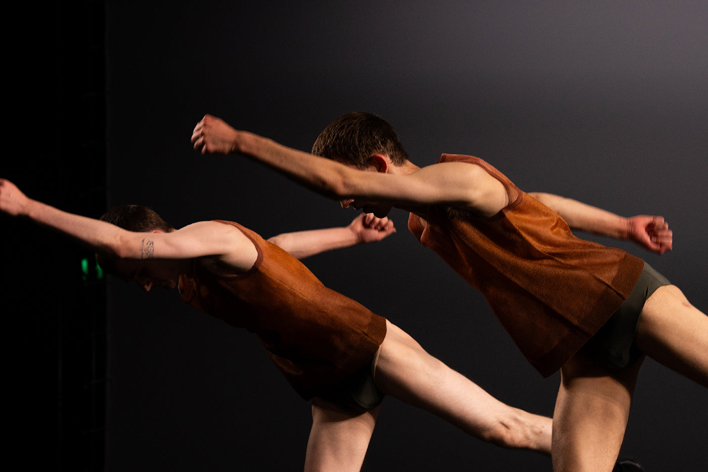 Flynn Dakis and Jesper Harrison move like the extended limbs of the stationary scissor lift—without the other, nothing is possible. Dakis is the left leg to Harrison’s right leg, the left arm to Harrison’s right. In costumes designed by Andrew Treloar, they are also a mirror image of each other. With one short sock on their left and right legs respectively, and one long sock on their other legs, they stitch together to make a whole. Their briefs, too, leave one chilly (presumably, I project) left or right cheek exposed. This playful lopsidedness runs counter to their precision. Two Victorian College of the Arts graduates, their movements are finely honed. Together they make and move as a machine. A machine of criss-crossed limbs, but this human machine moves, where the scissor lift does not. Facing each other, with one arm repeatedly swinging and connecting with the small of each other’s back, the contrast is as pronounced as it is mesmeric.