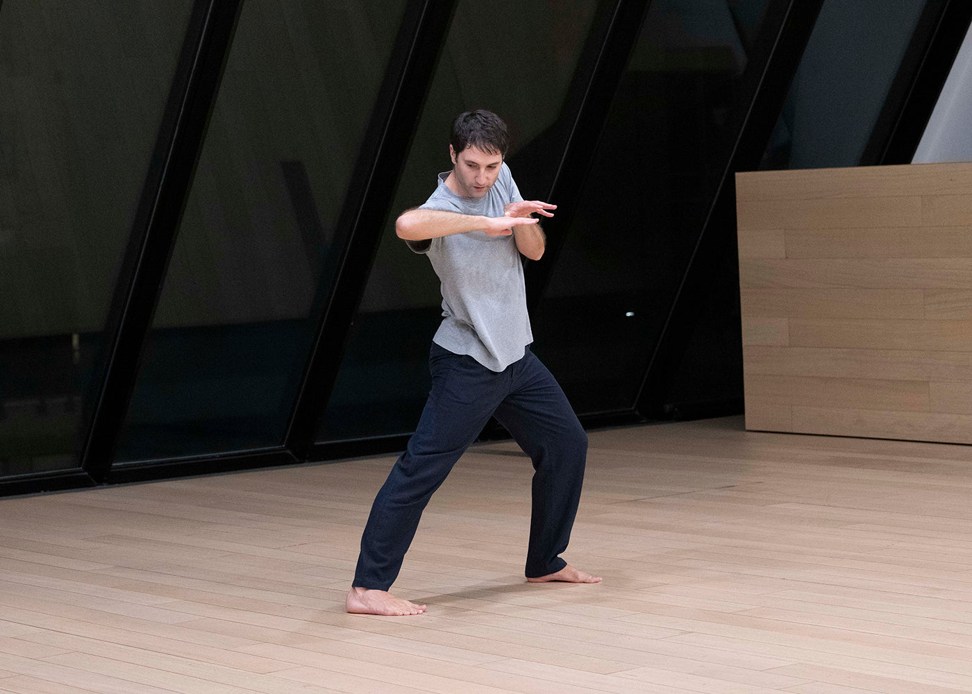 Noé Soulier enters the space without warning, and it takes a few seconds for the chattering audience to register the man now standing before them, dressed simply in a grey t-shirt and black pants, barefoot. This is, admittedly, an unconventional performance, and even the space itself establishes this.