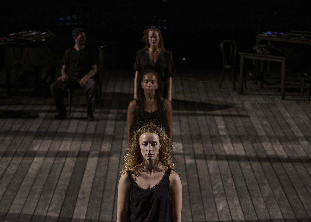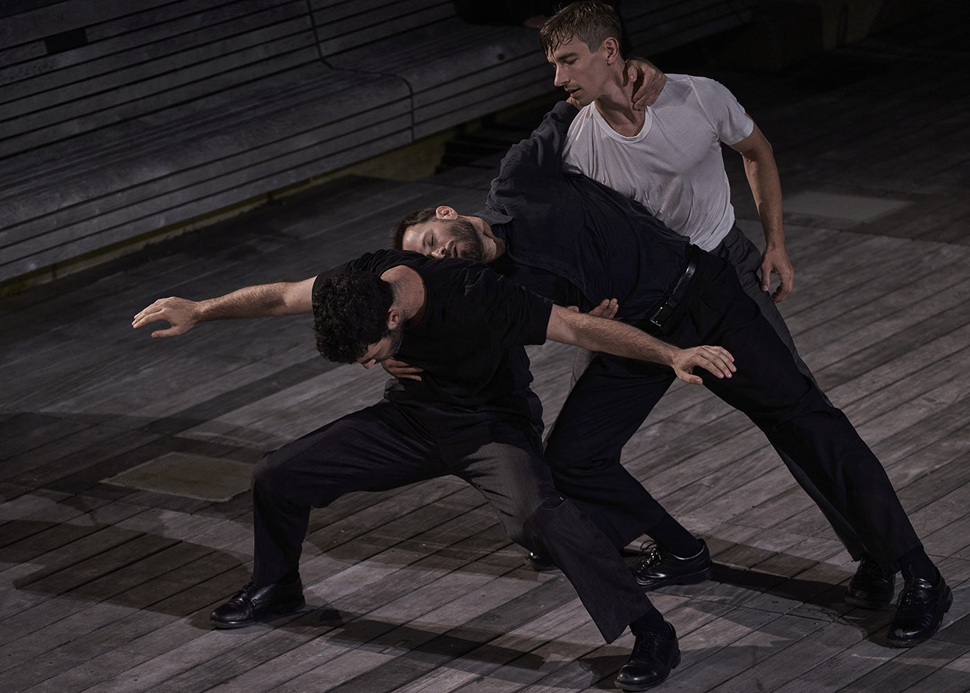 Two men enter the stage and hang suit jackets on the backs of chairs. They begin with a short movement phrase in staccato unison—an elbow juts over the shoulder as if an arrow sticking out of a quiver, then an arm slices cross-body like a sword. They repeat the phrase, then pace around each other, good-naturedly sizing each other up. A cellist takes a seat onstage, back to the audience, and begins a frenzied solo. The male duet develops into physical contact. A woman rushes into one man’s arms. The other climbs onto his back. Both men sink into wide plié and take comical galumphing steps. The stage is set for a tango salon—on steroids.