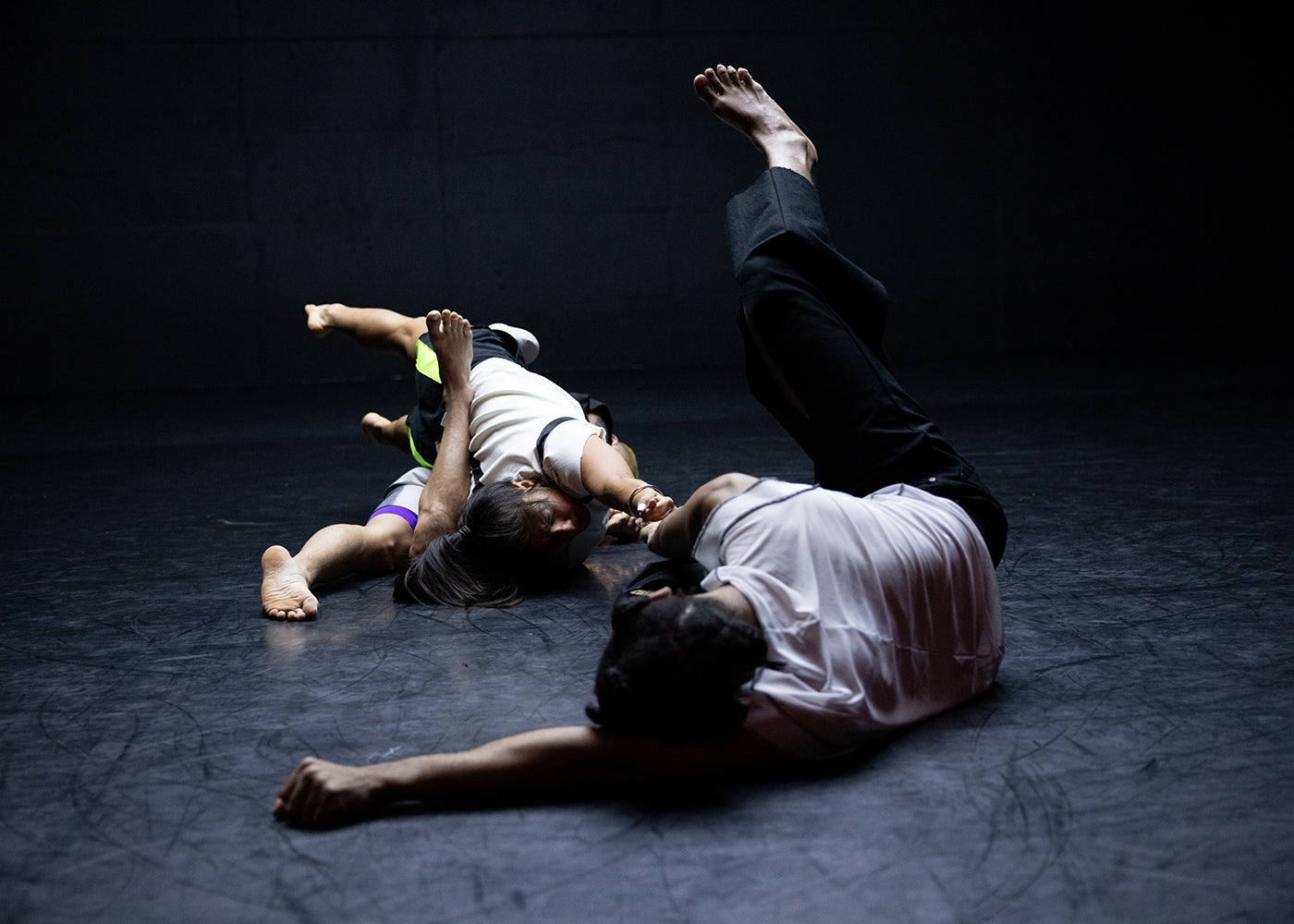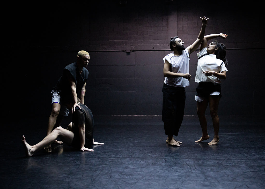 In the world premiere of Miguel Gutierrez’s “Super Nothing,” the quartet of performers fly through the vast, empty black box theater at New York Live Arts, small forms cast out like particles of light. In these diffuse intervals, Jay Carlon traces a speedy circle around the stage, sprinting while also somehow managing to get his hands down for a bear crawl in between strides. Evelyn Lilian Sanchez Narvaez ascends the house stairs, jingling her bracelets as if in communication with unseen spirits. Wendell Gray II and Justin Faircloth leap over one another in virtuosic play. Gravity, and any pull toward center stage, ceases to exist.