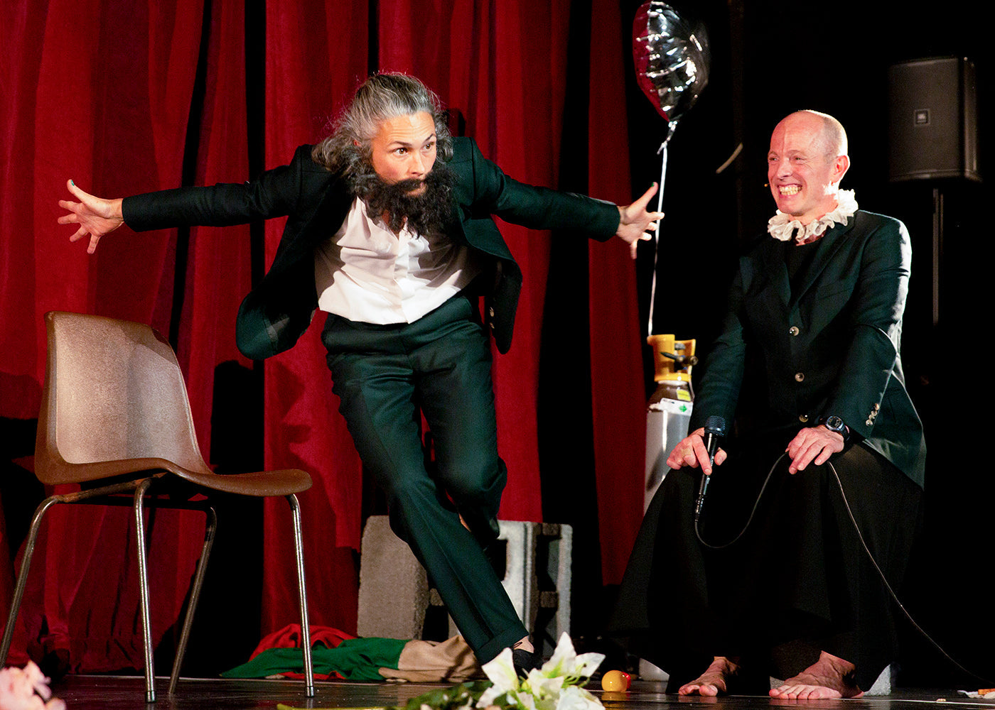 Rachel Poirier, Keegan-Dolan’s partner (both creative and romantic), accompanies him on stage, shoring up his musings with dramatic flourishes and background action. In the opening scene, she puffs on a cigarette and pulls a string of props—balloons, breeze blocks, bicycles—out of a crate, Mary Poppins-style, setting a suitably carnivalesque tone for the memories on parade. Most of the time she’s a welcome accessory to Keegan-Dolan’s diarising, especially in their joint cabaret send-up of an anti-Irish slur, although there are occasions when her antics intrude rather than complement.